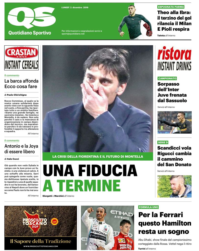 Montella rimane ma la fiducia nell’Aeroplanino è limitata. Su questo apre le pagine sportive La Nazione che titola “Una fiducia a termine”.