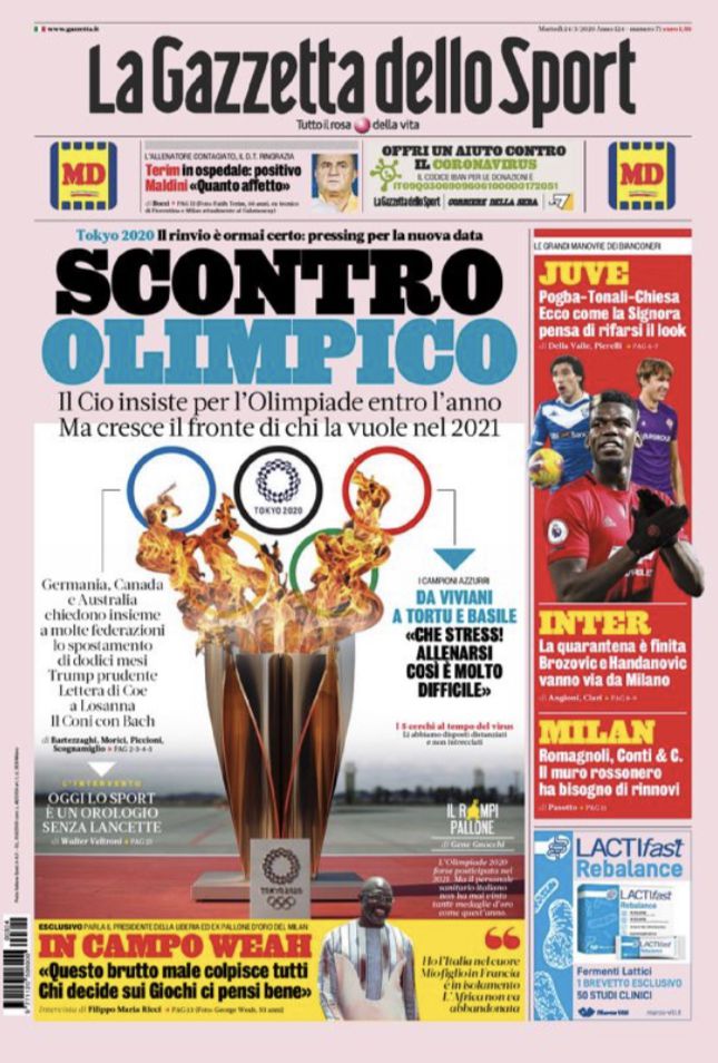 RASSEGNA STAMPA, Le prime pagine dei quotidiani sportivi Redazione 24 Marzo 2020 Ecco le prime pagine di questa mattina: