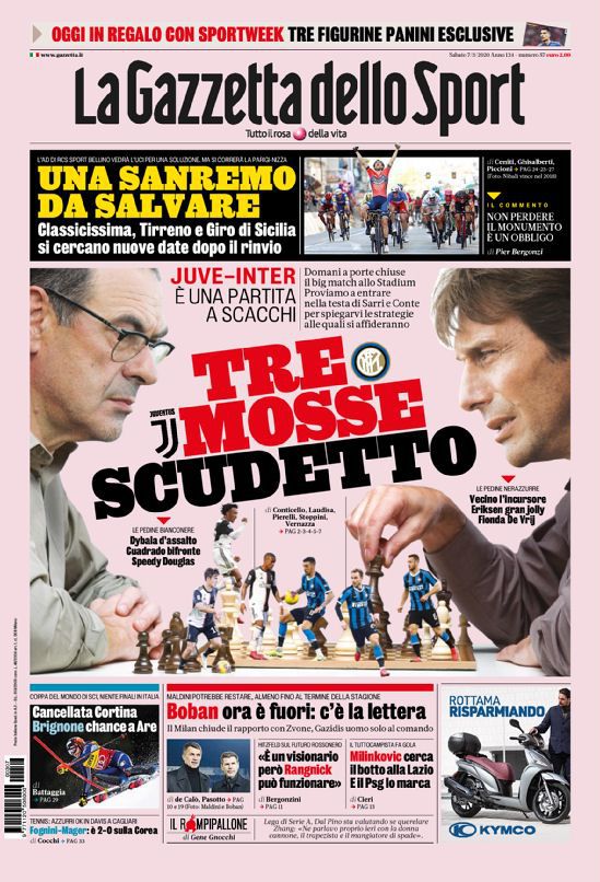 RASSEGNA STAMPA, Le prime pagine dei quotidiani sportivi di oggi Redazione 7 Marzo 2020 Di seguito le prime pagine dei quotidiani sportivi di oggi sabato 7 marzo.