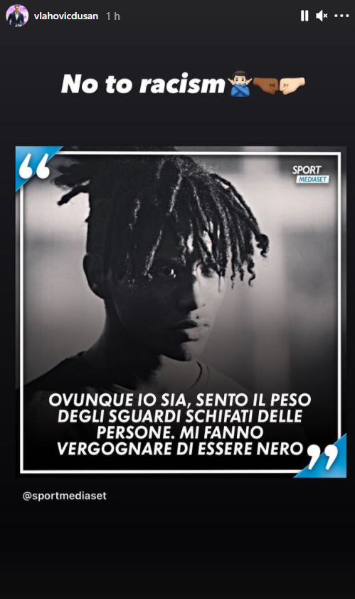 Con una storia pubblicata sul proprio canale Instagram Dusan Vlahovic ha voluto trasmettere un chiaro segnale riguardo al suo pensiero circa la lotta al razzismo. Citando la notizia di cronaca nera, che ha coinvolto Seid Visin, un giovane calciatore di 20 anni scomparso suicida, l’attaccante viola si schiera apertamente contro il razzismo. Ecco qui di seguito il post riportato: