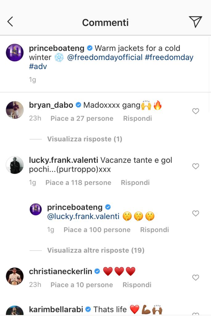 Boateng ha risposto sui social ad un tifoso che lo accusava di fare più vacanze commentando un post da lui pubblicato su Instagram, l’attaccante viola ha risposto facendo segno con le emoticon di stare zitto. Ecco il battibecco :
