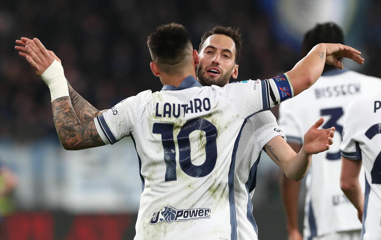 Lautaro Martinez e Hakan Calhanoglu (Photo by Marco Luzzani/Getty Images via One Football)