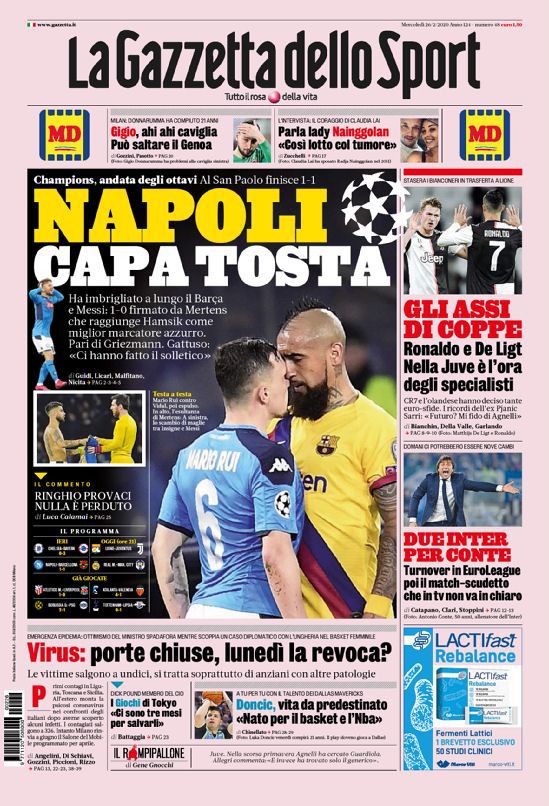 RASSEGNA STAMPA, Le prime pagine dei quotidiani sportivi di oggi Redazione 26 Febbraio 2020 Di seguito le prime pagine dei quotidiani sportivi di oggi mercoledì 26 febbraio.