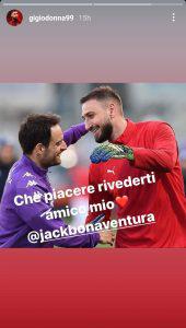 Nella giornata di ieri è stata disputata la gara valevole per il campionato di Serie A tra Fiorentina e Milan, che ha visto un campo un grande ex: Jack Bonaventura. Dopo numerose stagioni insieme ai rossoneri, il centrocampista ha firmato per la Fiorentina. È rimasto in buoni rapporti con i suoi ex compagni, tra cui Gianluigi Donnarumma, che ha pubblicato questa foto sul suo profilo Instagram, attraverso le stories.