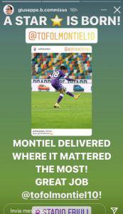 Giuseppe B. Commisso figlio del patron viola Rocco ha parlato attraverso una storia instragam di Cristobal Montiel, autore del gol della vittoria nel match di ieri contro l’Udinese, sottolineando come secondo lui ieri sera sia nata una stella. Ecco la storia in questione: