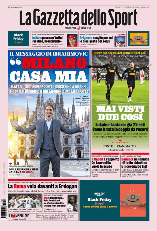 RASSEGNA STAMPA, Le prime pagine dei quotidiani Redazione 29 Novembre 2019 Queste le prime pagine dei quotidiani sportivi oggi in edicola.