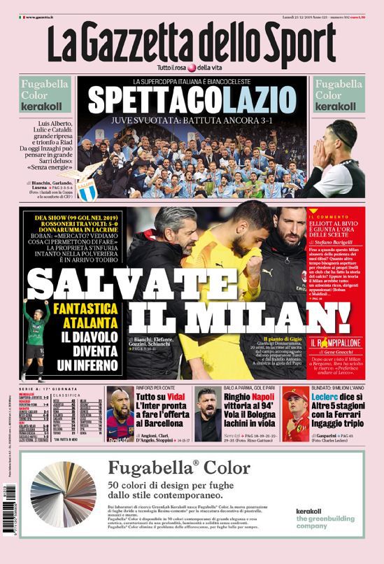 RASSEGNA STAMPA, Le prime pagine dei quotidiani sportivi di oggi Redazione 23 Dicembre 2019 Di seguito le prime pagine dei quotidiani sportivi di oggi lunedì 23 dicembre.