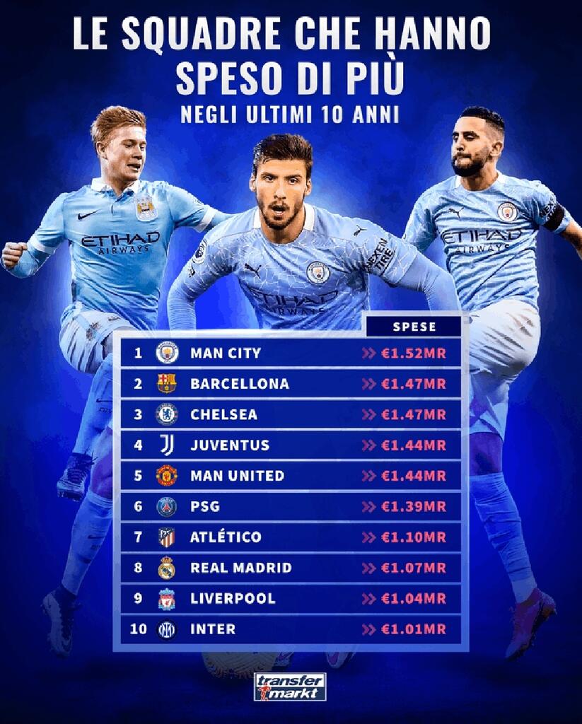 Transfermarkt ha stilato una particolare classifica: le dieci squadre che nel corso delle finestre di mercato degli ultimi dieci anni hanno investito maggiormente nel calciomercato. Il primato appartiene al Manchester City, ma bisogna far attenzione anche a Juventus ed Inter, rispettivamente quarta e decima.