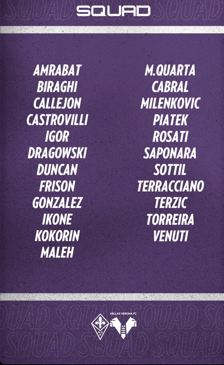 Ecco i 23 protagonisti: Amrabat, Biraghi,Cabral, Callejon, Castrovilli, Igor, Dragowski, Duncan, Frison, Gonzalez, Ikone, Kokorin, Maleh, Martinez Quarta, Milenkoivc, Piatek, Rosati, Saponara, Sottil, Terracciano, Terzic, Torreira, Venuti.