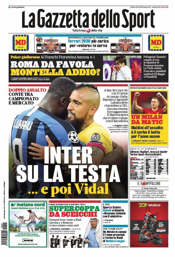 RASSEGNA STAMPA, Le prime pagine dei quotidiani sportivi Redazione 21 Dicembre 2019 Ecco le prime pagine di questa mattina:
