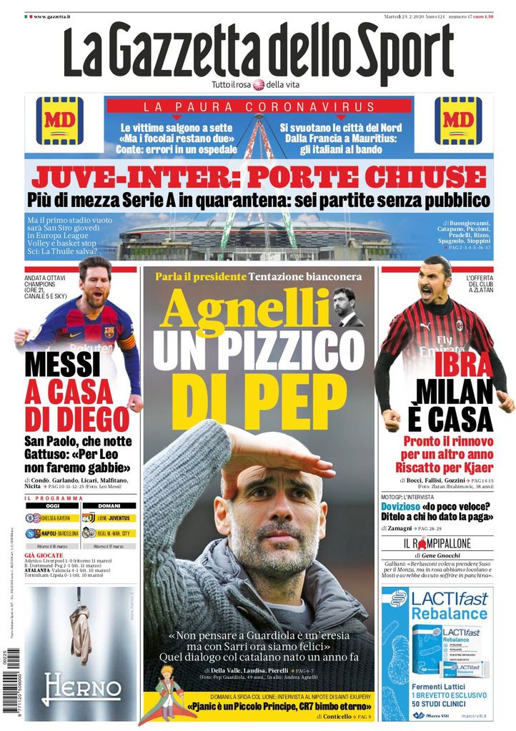 Questo il titolo in prima pagina della Gazzetta dello Sport che nel trafiletto in alto si sofferma sulla decisione presa ieri dal governo di comune accordo con la lega di serie A di giocare le partite di questo weekend, nelle zone in cui vige il divieto di manifestazione sportiva, a porte chiuse, il tutto ovviamente per via della situazione di emergenza legata al Coronavirus . Per quanto riguarda Udinese Fiorentina l’aspetto curioso riportato dalla rosea è legato al fatto che la regione Friuli in accordo con le sue società aveva già deciso di rinviare a lunedì la partita che si sarebbe però in quel caso giocata a porte aperte al pubblico.