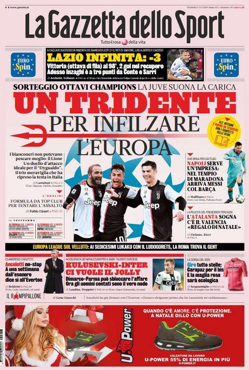 RASSEGNA STAMPA, Le prime pagine dei quotidiani sportivi Redazione 17 Dicembre 2019 Ecco le prime pagine dei maggiori quotidiani sportivi italiani, oggi in edicola: