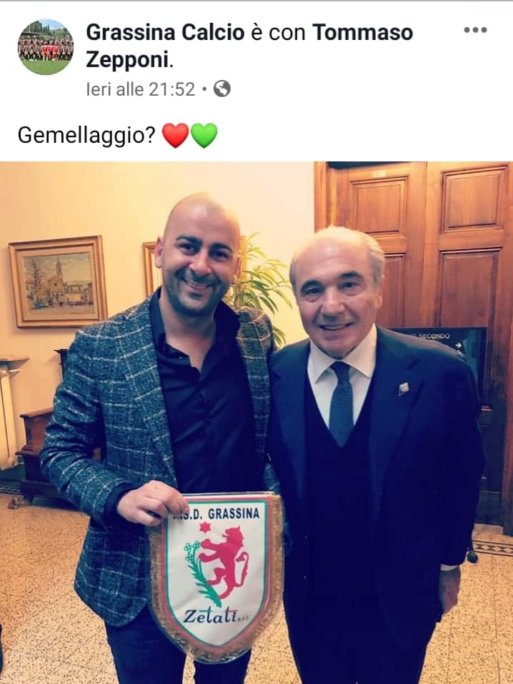Ieri, in occasione della presentazione della bozza del progetto centro sportivo della Fiorentina, il patron Rocco Commisso ha conosciuto Tommaso Zepponi, presidente del Grassina. Zepponi ha consegnato il gagliardetto rosso-verde a Commisso, aprendo alla possibilità di un gemellaggio tra le due società. “Si è confermato una persona gentile e disponibile, molto attenta al territorio. Speriamo, in futuro, di poter parlare con più calma. Mi auguro che questa nuova Fiorentina abbia la sensibilità di stringere rapporti più forti con le società dilettantistiche del territorio.” Queste le parole del presidente rosso-verde a sportchianti.it. In sovrimpressione, la foto, pubblicata sul profilo Facebook del Grassina calcio, che immortala l’incontro tra i due.