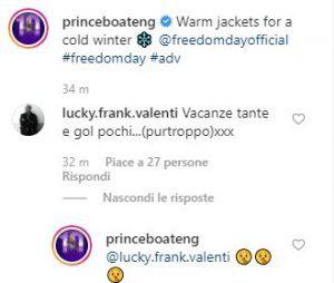 Il periodo negativo in maglia viola di Kevin Prince Boateng non è passato inosservato ai tifosi viola. Un appassionato, vedendo le immagini delle vacanze dell’attaccante postate sul profilo Instagram, ha colto occasione per sottolineare le prove non soddisfacenti del giocatore. “Vacanze tante e gol pochi” ha scritto. Immediata la risposta dell’ex Sassuolo, che con una emoticon ha invitato il tifoso a fare silenzio.