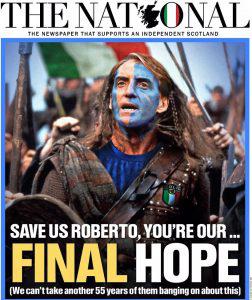 Nea giornata di oggi, alla vigilia della finale di Wembley contro l’Italia, il quotidiano indipendentista scozzese “The National” esce in edicola con una copertina provocatoria. Roberto Mancini indossa i panni di William Wallace in “Braveheart”, l’eroe medievale che combatté per la liberazione dal dominio inglese.