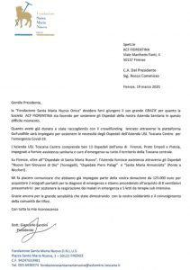 Il dott.Landini della Fondazione Santa Maria Nuova ONLUS risponde alla Fiorentina ringraziando il presidente Commisso per la donazione:
