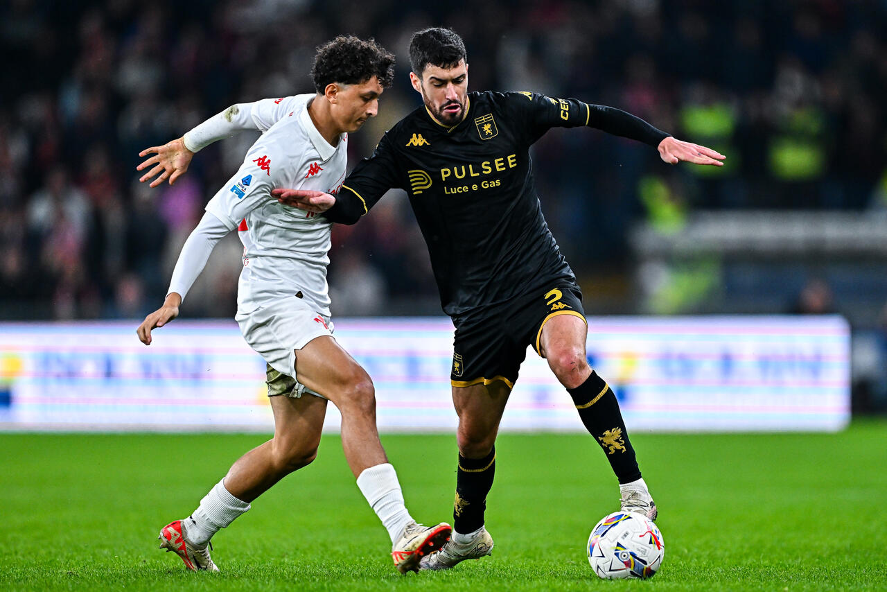 Tommaso Rubino e Aaron Martin in contrasto per impossessarsi del pallone durante Genoa-Fiorentina allo stadio Luigi Ferraris (Photo by Simone Arveda/Getty Images) via OneFootball