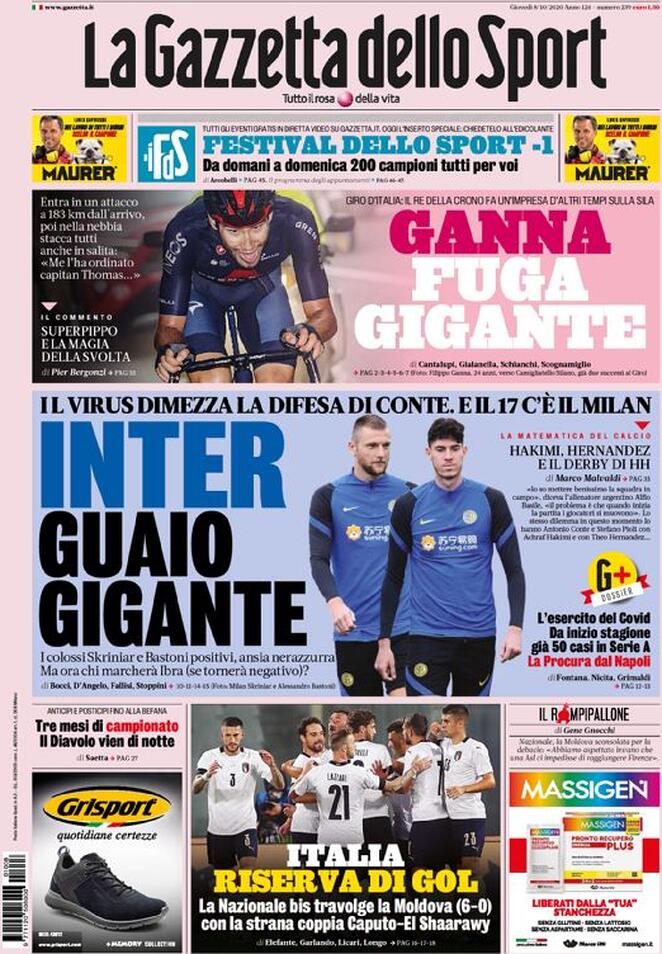 RASSEGNA STAMPA, Le prime pagine dei quotidiani sportivi di oggi Redazione 8 Ottobre 2020 Queste le aperture dei giornali sportivi di oggi.