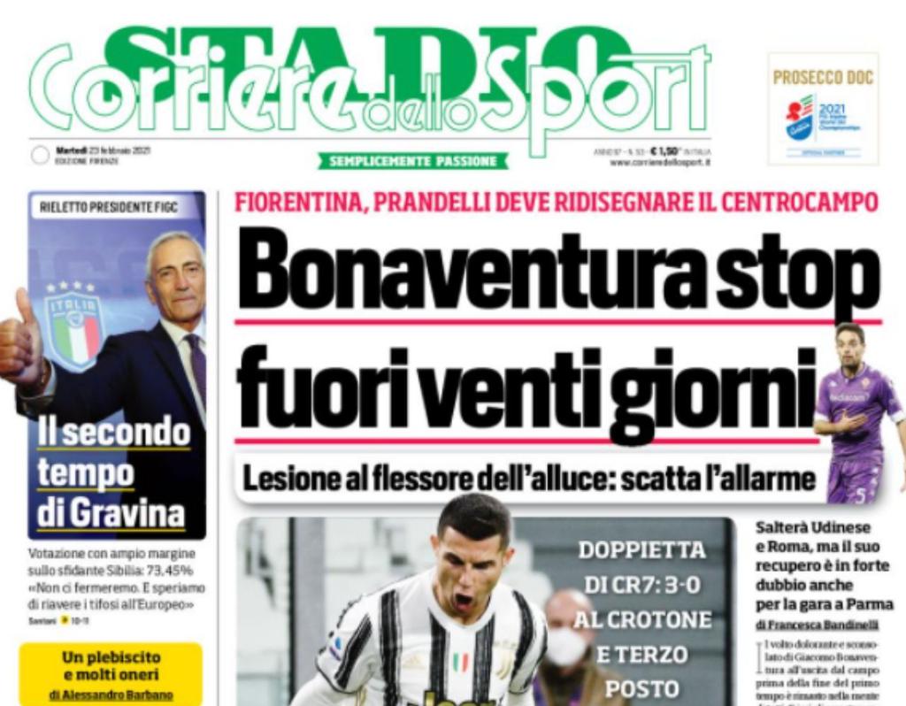 Ecco i titoli dei principali quotidiani di oggi sulla Fiorentina: Corriere dello Sport-Stadio: “Legnata Bonaventura, può star fuori tre partite”. Tuttosport: “Bonaventura: lesione muscolare”. Corriere Fiorentino: “Obiettivo Sarri”. Repubblica: “Le 15 giornate di Prandelli. Il futuro in gioco”. La Nazione: “Panchina viola, scrivania o l’addio. Il rebus Prandelli accende Firenze”.