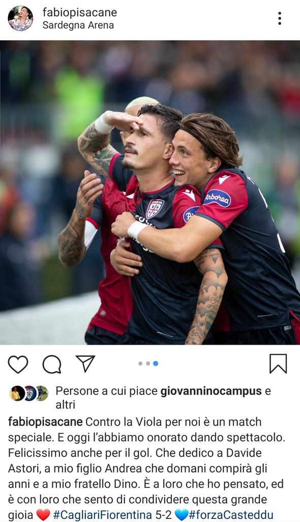Non poteva scegliere una dedica più bella. Fabio Pisacane ha celebrato la sua rete omaggiando il compianto capitano Davide Astori. “Contro la Viola per noi è un match speciale” scrive su Instagram. “E oggi l’abbiamo onorato dando spettacolo. Felicissimo anche per il gol. Che dedico a Davide Astori, a mio figlio Andrea che domani compirà gli anni e a mio fratello Dino. È a loro che ho pensato, ed è con loro che sento di condividere questa grande gioia“.