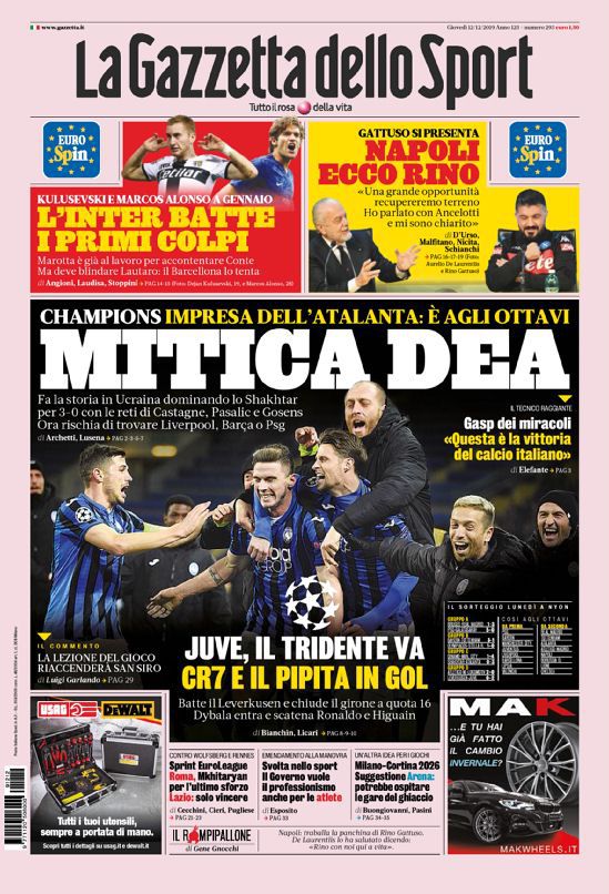 RASSEGNA STAMPA, Le prime pagine dei quotidiani sportivi di oggi Redazione 12 Dicembre 2019 Di seguito le prime pagine dei quotidiani sportivi di oggi giovedì 12 dicembre.