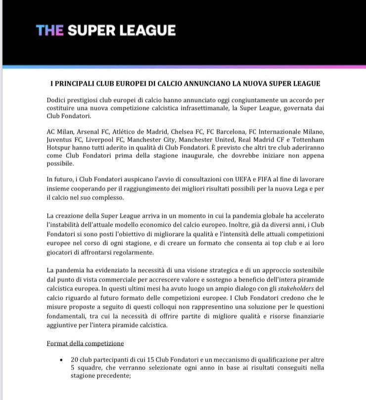 È nata ufficialmente la Superlega, una nuova competizione nata dai 12 principali club europei e a cui parteciperanno Inter, Milan e Juventus. Ecco il comunicato: