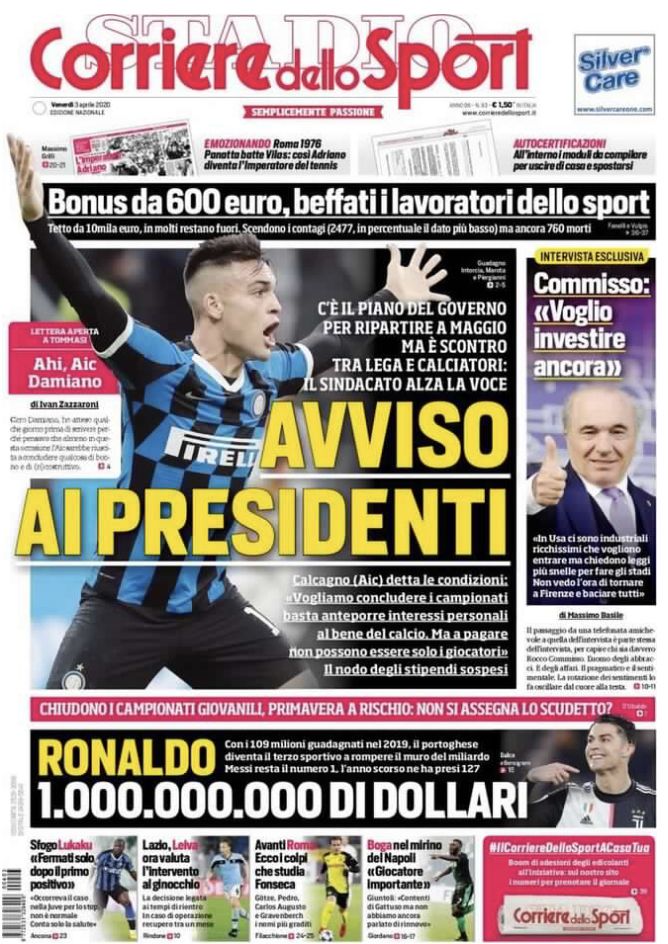 RASSEGNA STAMPA, Le prime pagine dei quotidiani sportivi Redazione 3 Aprile 2020 Ecco le prima pagine di questa mattina: