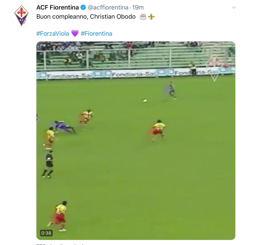 La Fiorentina celebra Christian Obodo, ex centrocampista viola che oggi compie 36 anni,pubblicando sui propri profili social il video della sua prodezza da metà campo messa a segno nel match casalingo contro il Lecce nel corso della ragione 2004/2005. Ecco il post social completo con le immagini di quella rete: