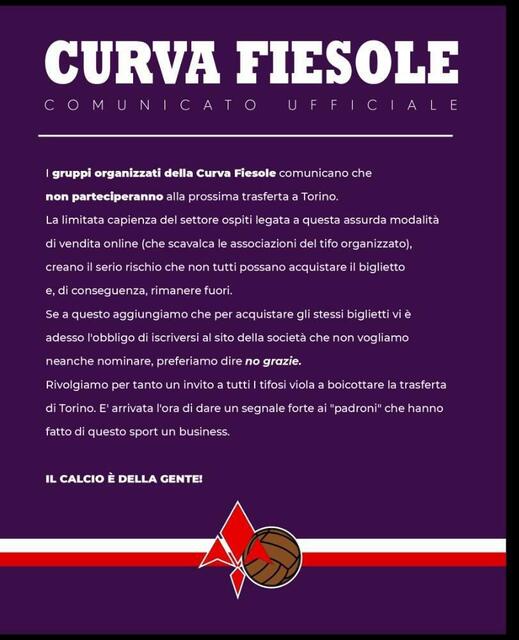 CURVA FIESOLE: “Non prenderemo parte alla trasferta di Torino. Le modalità di acquisto e la capienza non permettono a tutti di entrare” Redazione 2 Novembre 2021 Questo il comunicato della Curva Fiesole che non prenderà parte alla trasferta di Torino contro la Juventus: