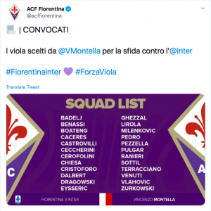 La Fiorentina ha comunicato i convocati per la partita che vedrà la squadra di Montella affrontare l’Inter. Di seguito la lista completa:
