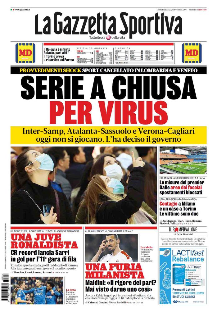RASSEGNA STAMPA, Le prime pagine dei quotidiani sportivi Redazione 23 Febbraio 2020 Ecco le prime pagine di stamattina: