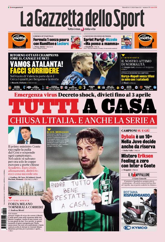 RASSEGNA STAMPA, Le prime pagine dei quotidiani sportivi di oggi Redazione 10 Marzo 2020 Queste le aperture dei quotidiani di oggi martedì 10 marzo 2020.