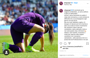 Alia Guagni ha pubblicato un post sul proprio profilo Instagram. Ecco il testo all’interno: “Si conclude qui la stagione 2019/2020…un anno sofferto e pieno di difficoltà!!! Anche il calcio femminile ha subito il colpo del coronavirus, e sono emerse le difficoltà che ci accompagnano ogni giorno con più forza! Ma una cosa l’abbiamo capita, c’è bisogno di rialzarsi più forti di prima e dare una svolta al nostro movimento! Noi calciatrici siamo nate per combattere, siamo abituate a farlo e non sarà questo stop a fermarci!💪🏼 Adesso, tutti insieme, troveremo il modo per ripartire nelle migliori condizioni con il prossimo campionato…nella speranza che lo si possa fare da Professioniste e non più soltanto da “atlete professionali”.