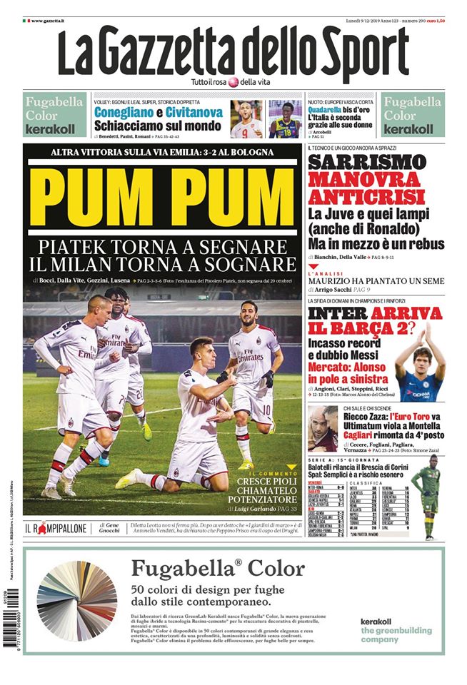 RASSEGNA STAMPA, Le prime pagine dei quotidiani Redazione 9 Dicembre 2019 Queste di seguito le prime pagine dei principali quotidiani sportivi oggi in edicola:
