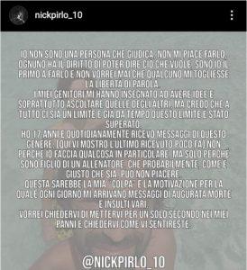 All’indomani della partita tra Fiorentina e Juventus, svolta social poco piacevole per il primogenito dell’allenatore bianconero, Andrea Pirlo, Niccolò, che come da lui rimarcato sui suoi profili social, ormai da mesi sta ricevendo offese e anche auguri di morte, da parte di tifosi detrattori del padre. Il diciassettenne ha reagito con un accorato post: “Avete superato il limite. Mettetevi nei miei panni”.