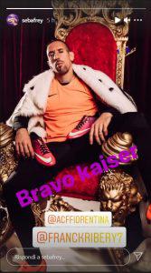 L’ex portiere viola Sebastian Frey, ha dedicato una storia all’amico Franck Ribery, per celebrare il primo goal in questa stagione, segnato ieri sera contro il Torino. Nella foto postata dal portierone, FR7 siede su un trono e gli viene affettuosamente attribuito il titolo di “Kaiser”.