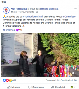 A poche ore da #TorinoFiorentina il presidente Rocco #Commissoin visita a Superga per rendere onore al Grande Torino | Rocco Commisso visits Superga to honour the Grande Torino side ahead of #TorinoFiorentina. Sulla pagina ufficiale Facebook dell’ACF Fiorentina il video che ritrae il presidente a Superga per l’omaggio al Grande Torino: