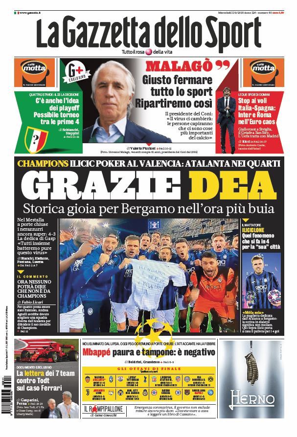 RASSEGNA STAMPA, Le prime pagine dei quotidiani sportivi Redazione 11 Marzo 2020 Ecco le prime pagine di questa mattina: