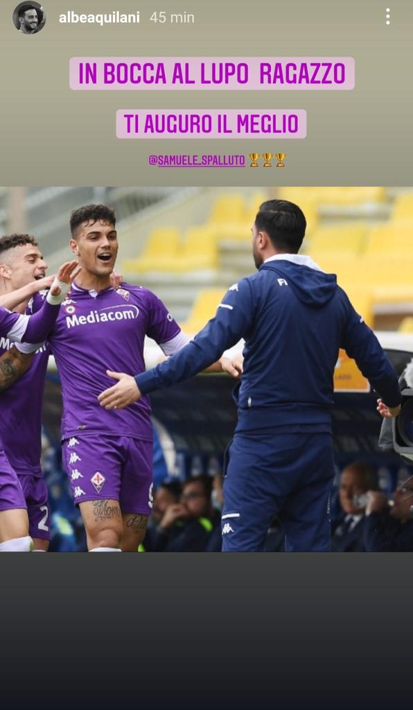 Con una storia Instagram pubblicata pochi istanti fa sul proprio profilo ufficiale l’allenatore della Primavera della Fiorentina Alberto Aquilani condivide uno scatto fotografico assieme al suo giocatore Samuele Spalluto, ceduto in prestito al Gubbio proprio nella giornata di oggi, augurandogli buona fortuna. Ecco il messaggio ben augurante dell’allenatore rivolto al ragazzo: