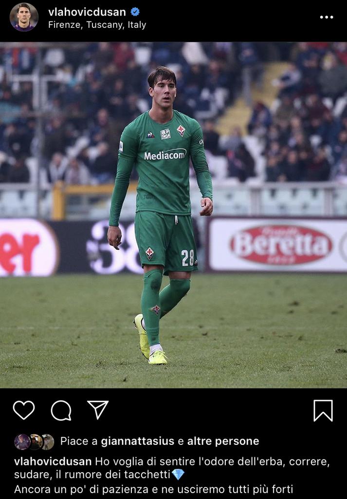 Dusan Vlahovic scalpita. Il ragazzo sta bene, si è ripreso dall’infezione da coronavirus ed è pronto per ricominciare. Peccato che il campionato sia destinato a restare fermo ancora non si sa per quanto, ma al serbo importa poco. “Ho voglia di tornare a sentire l’odore dell’erba, correre, sudare, il rumore dei tacchetti. Ancora un po’ di pazienza e ne usciremo tutti più forti”, le parole del serbo. Ecco il post su Instagram: