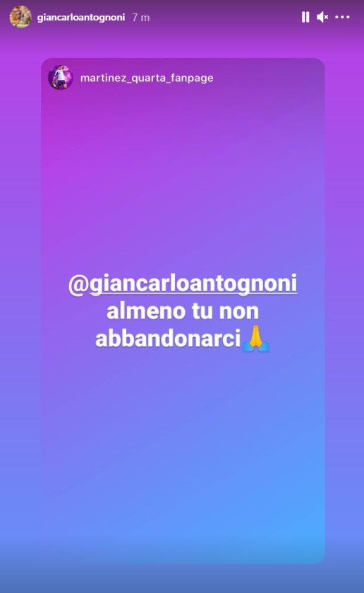 Con una storia molto chiara pubblicata sul proprio canale Instagram Giancarlo Antognoni condivide il messaggio rivoltogli da una fanpage di Martinez Quarta con l’eloquente messaggio “Giancarlo Antognoni almeno tu non abbandonarci”. Eccolo qui di seguito riportato: