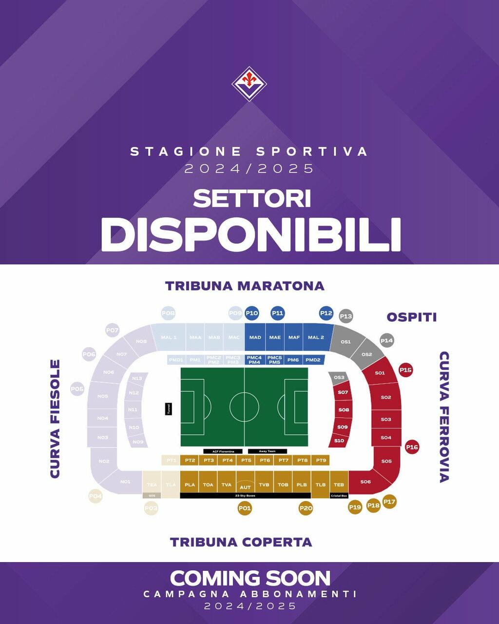 ACF Fiorentina informa che, in base alla convezione firmata con il Comune di Firenze per la stagione calcistica 2024/25, queste sono, al momento, le informazioni a disposizione del Club e le porzioni dei settori (le aree non colorate sulla mappa) che verranno escluse dalla possibilità di vendita