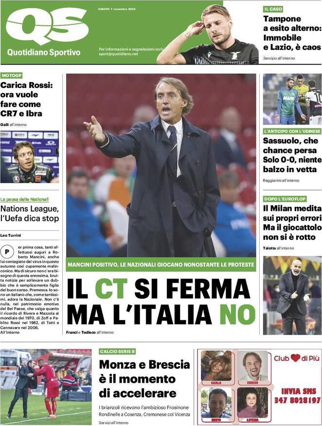 Questa è l’apertura scelta dal Quotidiano Sportivo: “Roberto Mancini positivo, le nazionali giocano nonostante le proteste”. A lato, piccolo spazio anche per l’anticipo di ieri tra Sassuolo e Udinese finito 0-0, mentre in altro il quotidiano analizza la situazione tamponi in casa Lazio.