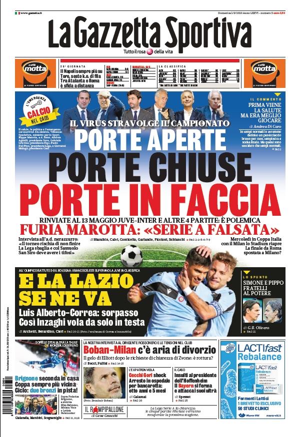 RASSEGNA STAMPA, Le prime pagine dei quotidiani sportivi Redazione 1 Marzo 2020 Queste le principali pagine dei quotidiani sportivi oggi in edicola