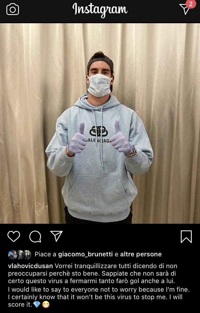 Dusan Vlahovic ha pubblicato su Instragram una foto in cui ha tranquillizzato tutti dopo essere risultato positivo al Covid-19: ”Vorrei tranquillizzare tutti dicendo di non preoccuparsi perché sto bene. Sappiate che non sarà di certo questo virus a fermarmi tanto farò gol anche a lui”.