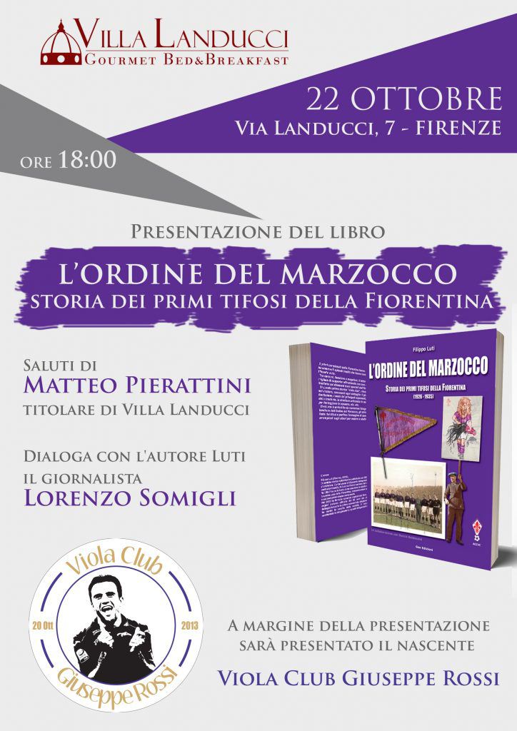 “L’Ordine del Marzocco” sarà presentato nella splendida cornice di Villa Landucci a Firenze (via Landucci 7, vicino piazza Alberti) il prossimo giovedì 22 ottobre alle 18:00. Dialoga con l’autore il giornalista Lorenzo Somigli. Saluti di Matteo Pierattini, titolare di Villa Landucci. A margine dell’evento sarà presentata una nuova casa per i cuori viola: il Viola Club Giuseppe Rossi, dedicato all’indimenticato numero 49 della Fiorentina.